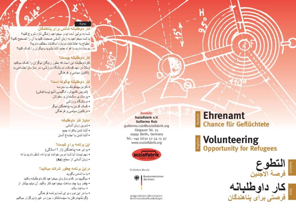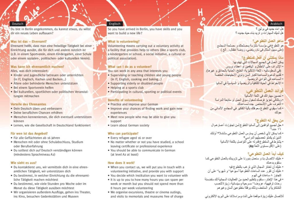 In einem ersten Schritt sollen geflüchtete Menschen, die Interesse an der Ausübung einer ehrenamtlichen Tätigkeit haben, erreicht werde. Diese werden von uns in Flüchtlingsunterkünften, Sprachkursen und Initiativen von Kooperationspartnern aufgesucht, um Ihnen das Prinzip und die Vorteile einer ehrenamtlichen Tätigkeit zu erläutern. Ferner werden Informationsveranstaltungen und individuelle Beratungen sowohl auf Deutsch als auch in der Herkunftssprache der geflüchteten Menschen stattfinden.